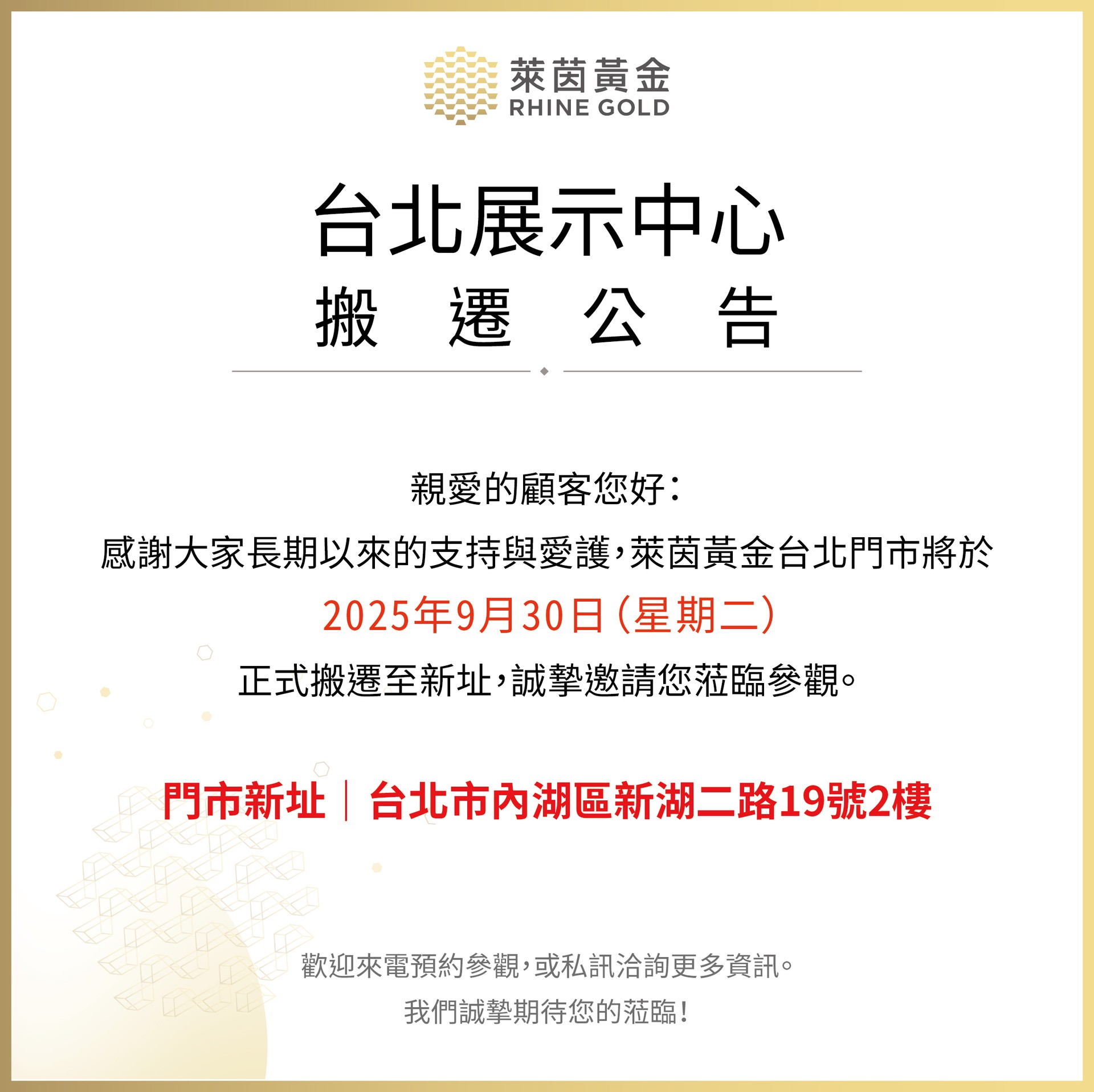 萊茵黃金台北展示中心將於2025年9月30日(二)正式搬遷至新址,誠摯邀請您蒞臨參觀。